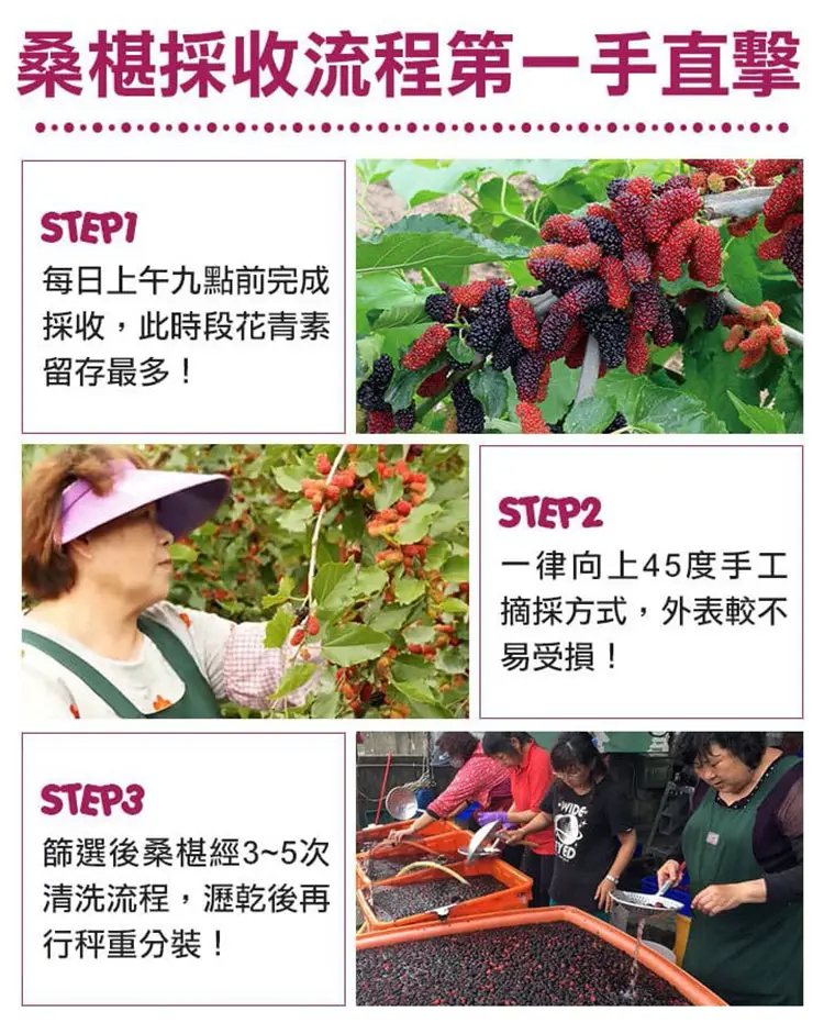 採收45度手工採摘,帥選後的桑椹要經過3-5次清洗